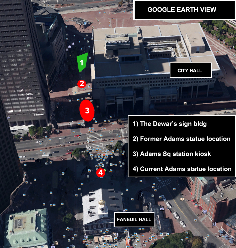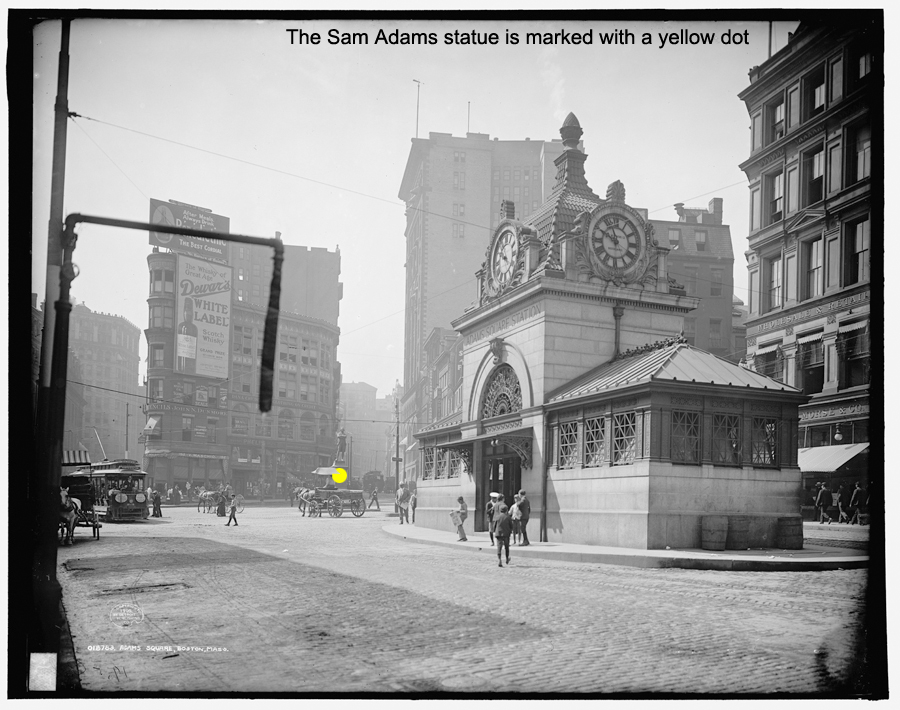 Here is a 1905 photo of Adams Square. The subway kiosk in the center of the photo is where the steps are in the top photo. Notice the Samuel Adams statue in the distance just beyond the kiosk. The street immediately left of the building with the Dewar's sign is Cornhill. The street to the right of it is Brattle. Both of these streets are gone today. The trolley is approaching Adams Square from Washington Street which now ends at State Street.
