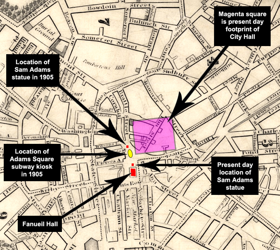 Boston map of 1832. See the little red squares which mark the former and present locations of the Samuel Adams statue.