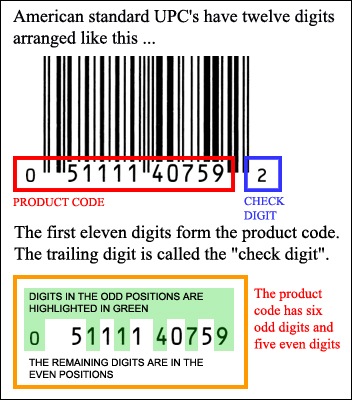 A check digit is a redundancy check used for error detection. It consists of a single digit computed from other digits in the message. When a barcode is scanned, the check digit is computed with a standardized algorithm using various operations on the other digits. The computed check digit is then compared to the check digit value explicitly encoded in the trailing end of the bars. If the values are equal, the scan is assumed to be successful, otherwise an error was detected resulting in a failed scan. Note: This demo will not work with 8-digit truncated barcodes or with any non-American standard barcodes. |