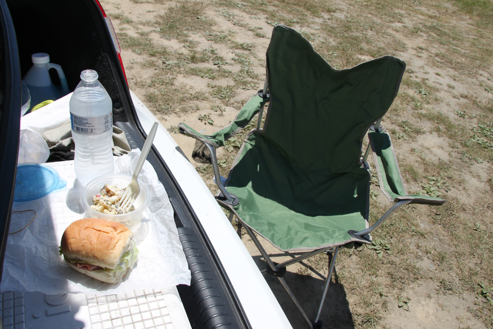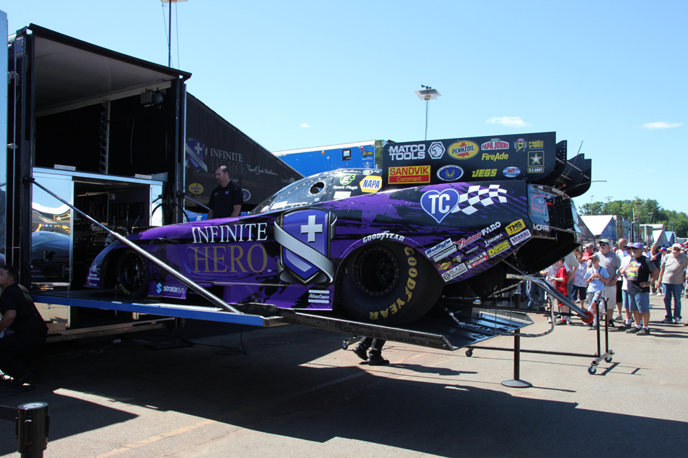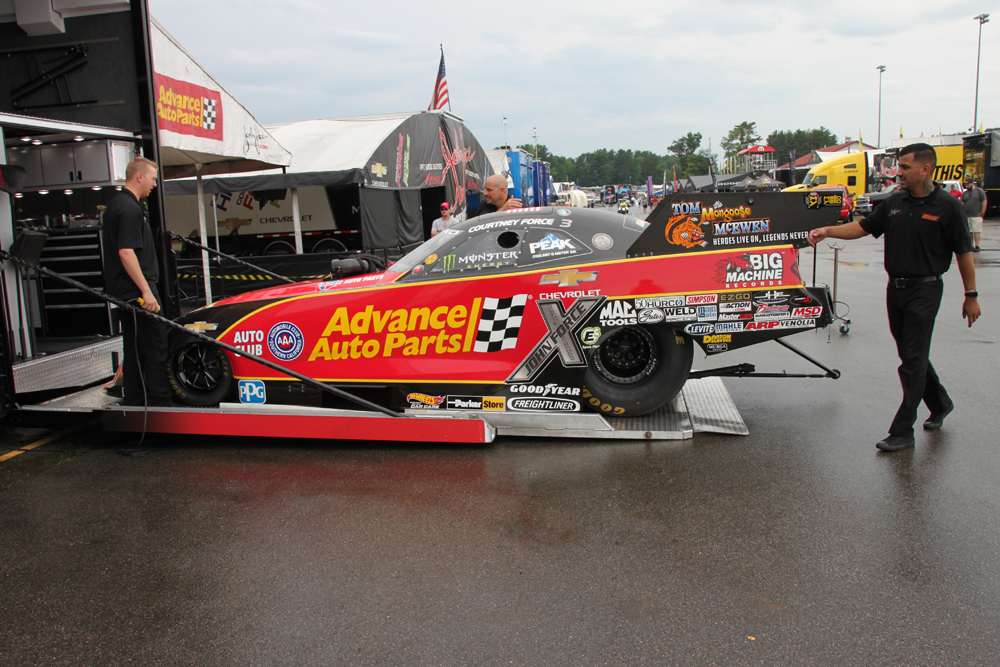 | Unloading the Courtney Force Funny Car Friday morning after the rain |