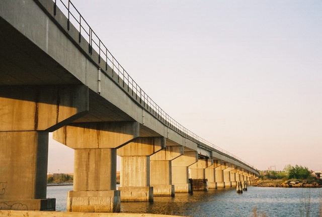 The MBTA Commuter Rail Newburyport/Rockport line's Mystic River crossing at Draw Seven Park, Somerville, MA.