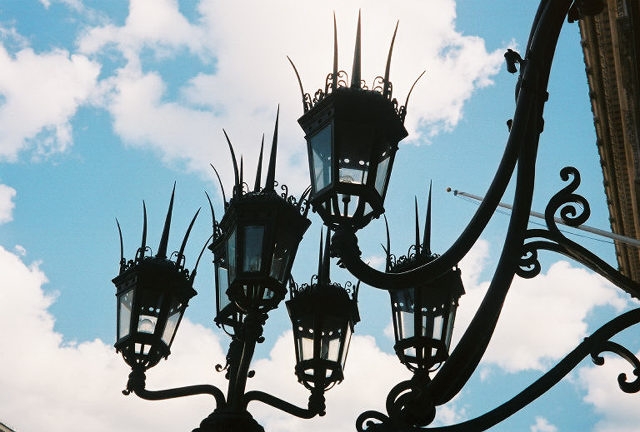 Gothic lanterns adorn the entrance of the Boston Public Library on Dartmouth Street.