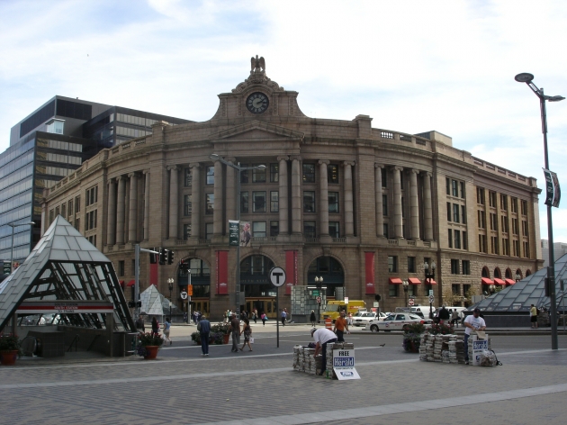 South Station, Boston, MA. The exterior facade was built in 1899 and the interior was fully renovated in 1989. Early photos of South Station depict the old elevated trolley rails skirting the building. Future photos will show a 620-ft tower rising directly behind the facade that is scheduled for completion in 2010. |