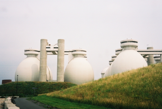 The enormous sludge digesters at Deer Island Waste Water Sewage