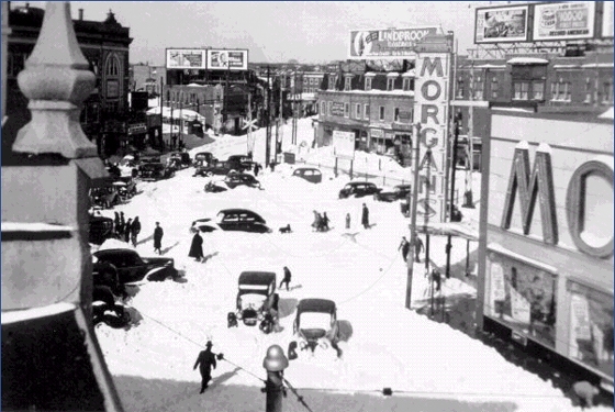 A snowstorm paralyzes Davis Square in the 1940's. The Somerville Theatre can be seen on the left side of the photo in the distance.